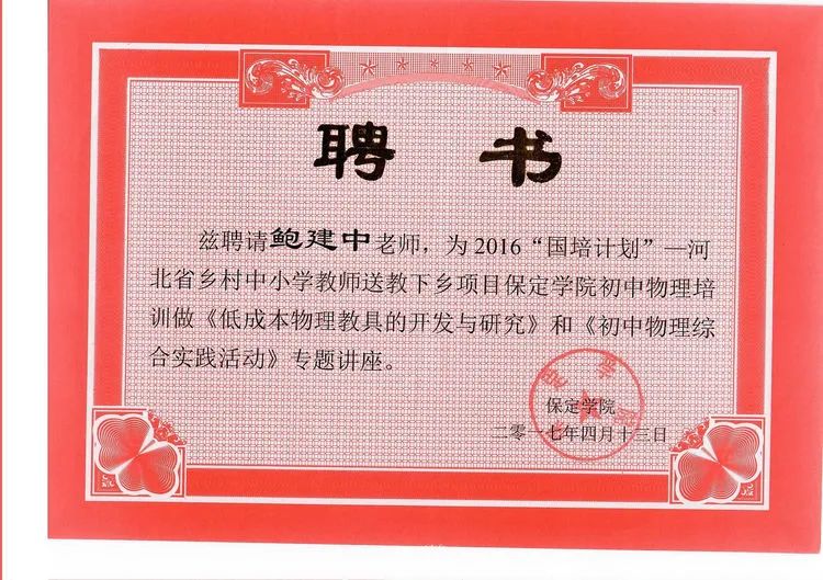 鲍老师立足本职岗位,扎实工作,勤于总结。为了惠及全国更多的教师和学生,为国家培养更多社会需要的创新型人才,近年来,鲍老师多次承担学校及教育主管部门委派的省市及国家级的教学培训;参加了16、18,19、20年的中考试题点评,并在北京电视台做为特邀嘉宾解析了当年的中考试题;接待外校、外省市教师到校的参观,学习和培训任务;承接丰台区各中小学、社区的科学宣传工作,至今已近千人次;自发组织学生走进三乐老年公寓,使学生们用趣味实验向老年人献上了关心和慰问,实现了科技育人和活动育人。